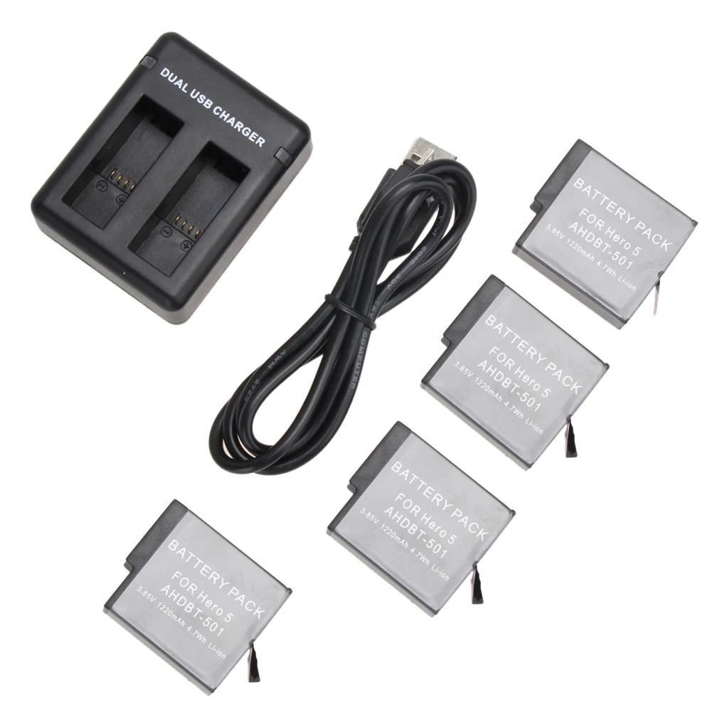 Main Features : 4X 1220mAh battery bateries for Gopro hero 5 battery + 1X Dual USB Slot Charger for Gopro Hero5 camera accessories