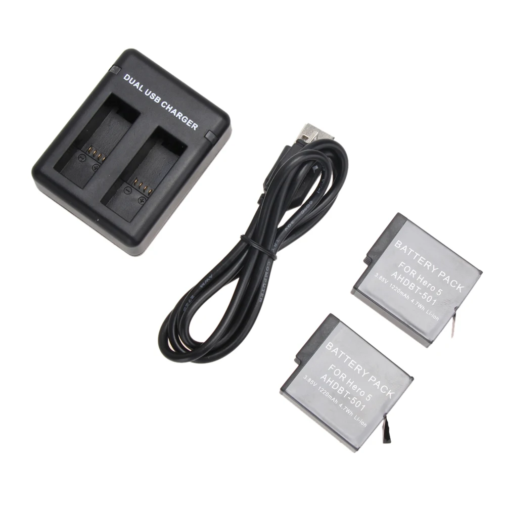 Main Features : 2pcs 1220mAh GoPro hero 5 Battery AHDBT-501 Battery + 2 Way Dual USB Charger for Go Pro 5 GoPro Hero 5 Action Camera Accessory